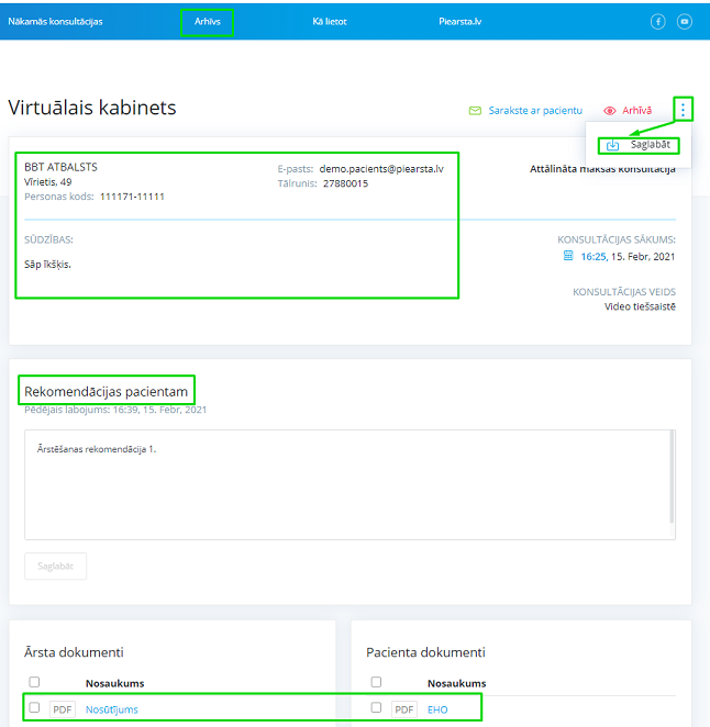 izveidojas ZIP arhīvs ar vispārējo informāciju par konsultāciju, konsultācijas laikā pievienotiem dokumentiem, rekomendācijām un tiešsaistēs sarakstes ziņojumiem. Arhīvu būs iespējams saglabāt ārsta datorā ! jo informācija attālināto konsultāciju platformā glabāsies tikai dažas dienas !