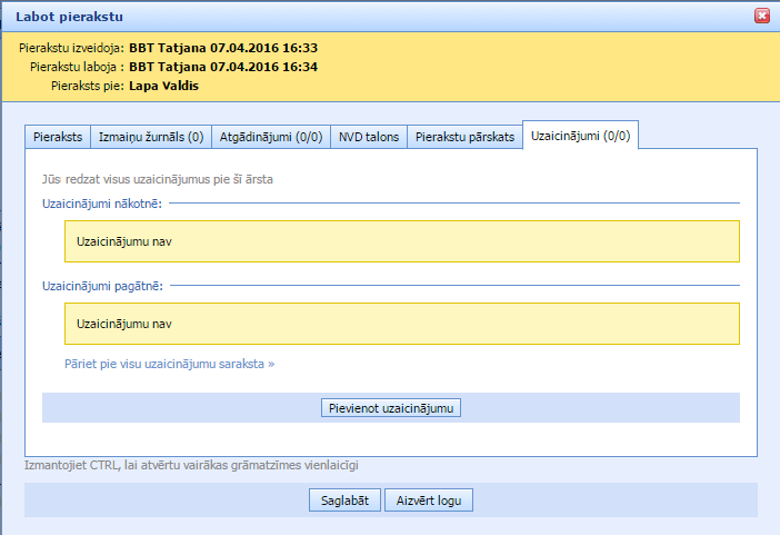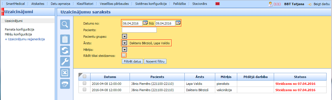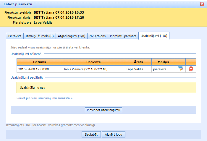 Pierakstu sadaļā pie šī pacienta būs redzami jau divi uzaicinājumi: