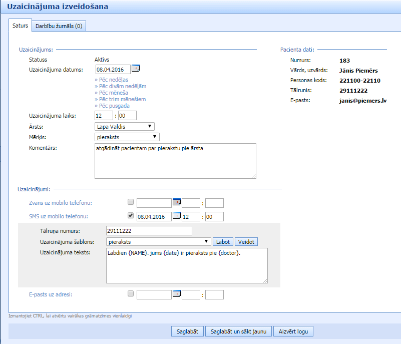 Gadījumos, kad pacients jau pierakstījās pie ārsta, var veidot uzaicinājumu administratoriem atgādināt par pierakstu pirms pieņemšanas laika. Tad izveidot uzaicinājumu var no sadaļas SmartMedical -> Pieraksti.