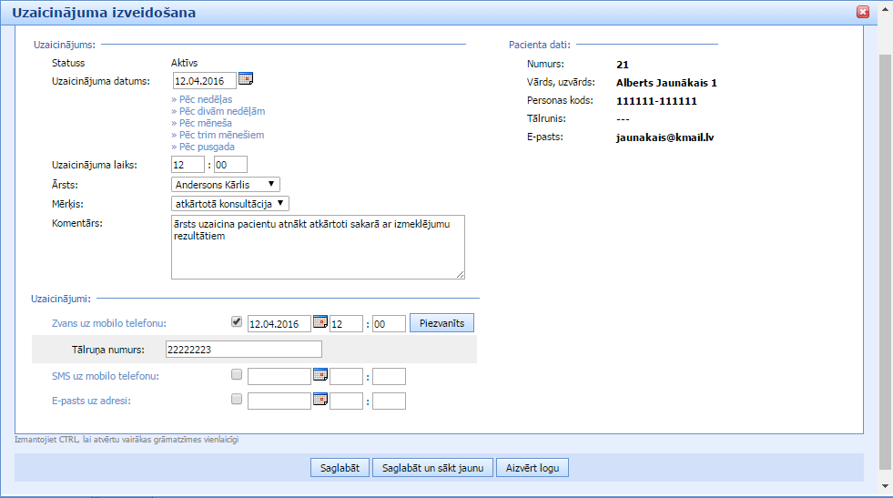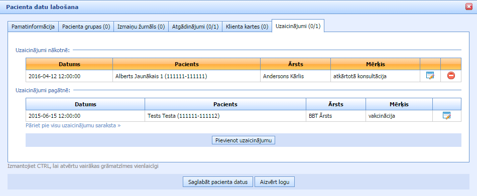 Kā redzam logā, šim pacientam jau bija uzaicinājumi pagātnē, tagad mēs pievienojam jaunu: