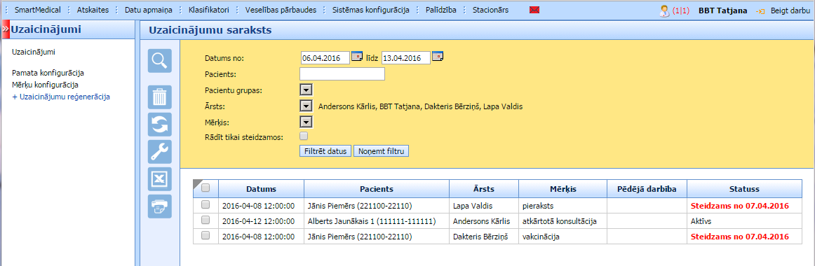 Visu uzaicinājumu sarakstu var redzēt sadaļā SmartMedical -> Uzaicinājumi -> Uzaicinājumu saraksts, norādot meklētājā attiecīgus parametrus – datumu, ārstus u.c.: