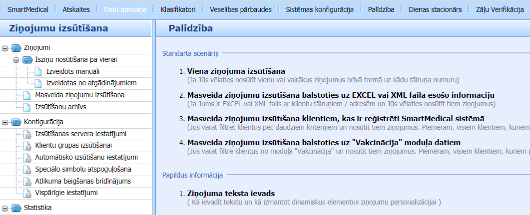Smart Medical izvēļņu joslā klikšķina “Datu apmaiņa”, izvēlas “Klientu ziņojumu izsūtīšana (SMS)” – iespēja pacientiem nosūtīt īsziņas (SMS) un atgādināt par pierakstu, aicināt uz konsultāciju, analīzēm vai citiem pakalpojumiem, kā arī informēt par jaunajiem pakalpojumiem, akcijām, izmaiņām pieņemšanas laikos utml. Rīks paredz īsziņu izsūtīšanu:- vienam klientam,- masveidā klientiem: