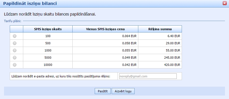 Klikšķina radiopogu, norādot izvēlēto tarifu plānu (100, 500, 1000, 5000 vai 10000), un ievada e-pasta adresi, uz kuru tiks nosūtīts rēķins par īsziņu izsūtīšanu. Klikšķina pogu “Pasūtīt“. Dienas laikā saņemsiet rēķinu par izvēlēto SMS tarifu plānu, kurš jāapmaksā dienas laikā, kā arī apstiprinājumu par SMS bilances papildināšanu.