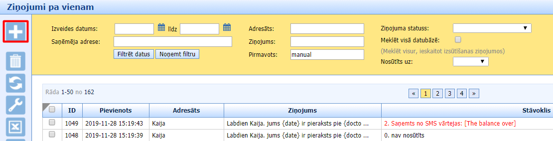 - sānu izvēlnē atver zaru Ziņojumi > Īsziņu nosūtīšana pa vienai > Izveidots manuāli,