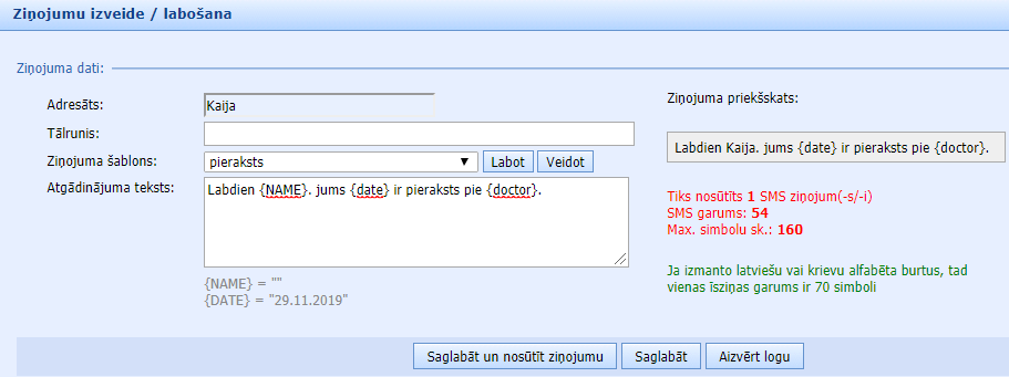 Ja izvēlētajā šablonā ir paredzēti lauki aizpildīšanai un to saturs ir saglabāts, labajā pusē tiek attēlots īsziņas teksts ar aizpildītiem laukiem. Sagatavotu un saglabātu īsziņu vēlāk var labot pēc nepieciešamības vai arī nosūtīt pacientam uzreiz, klikšķinot pogu “Saglabāt un nosūtīt ziņojumu“. Pēc ziņojuma izveides/ labošanas formas aizvēršanas tiek attēlots saraksts ar visām manuāli sagatavotajām, nosūtītajām vai kāda iemesla pēc nenosūtītajām īsziņām. Datus sarakstā var filtrēt pēc ziņojuma izveides datuma, statusa, adresāta, tālruņa numura, ziņojuma teksta satura fragmenta.Ja ziņojums pacientam ir nosūtīts, atverot ziņojuma ierakstu, var redzēt laiku, kad tas ir noticis: