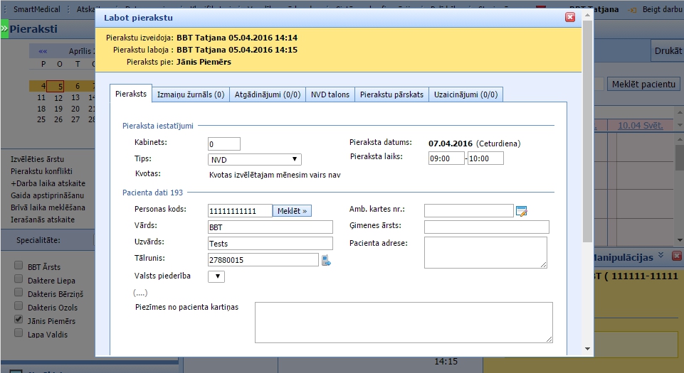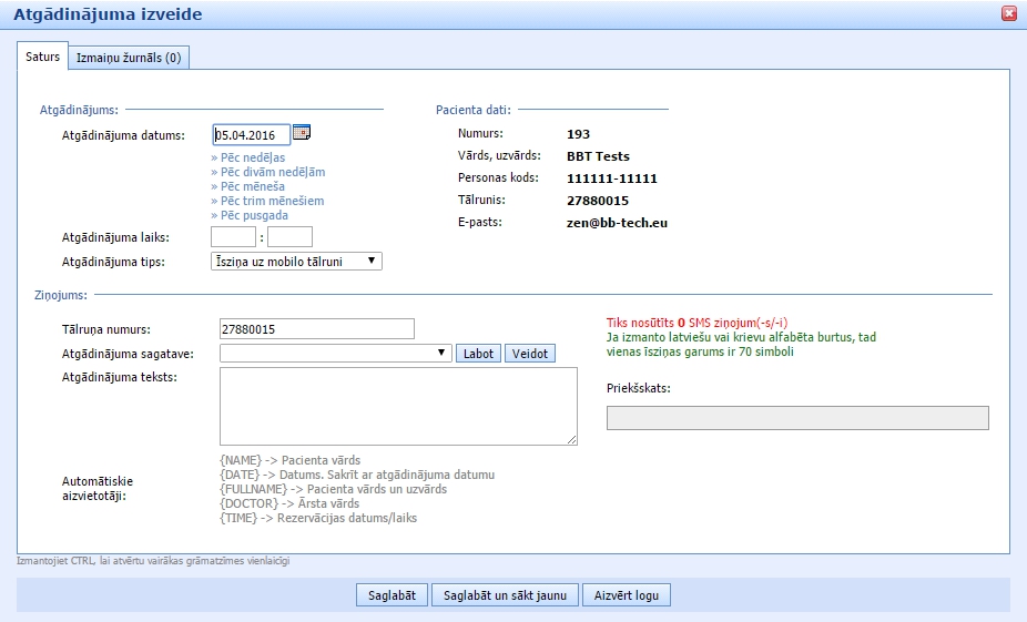 Ja pacientam izveidots pieraksts (SmartMedical > Pieraksti > Izvēlēties ārstu > …), var nosūtīt pacientam atgādinājumu par šo pierakstu pie ārsta. Lai to izdarītu, atver formas “Labot pierakstu” lapiņu “Atgādinājumi“.