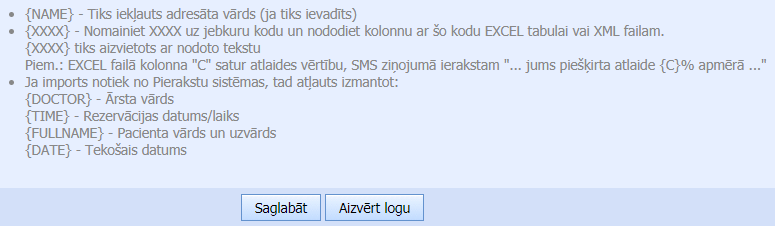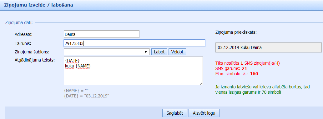 Pēc tam klikšķina pogu “Saglabāt”. Izpildoties noteiktiem nosacījumiem, tekstā lietderīgi iekļaut lauku nosaukumus figūriekavās, kuri konkrētajam adresātam tiks aizpildīti ar informāciju no datubāzes: