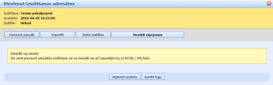 kuru klikšķinot, tiek attēlota saskarne ziņojuma adresātu izvēlei, izmantojot dažādus iespējamos izsūtīšanas veidus. Ir iespējas: