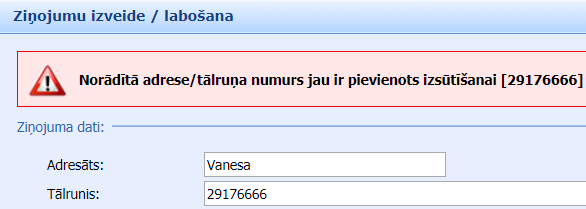 Pievienojot vairākus adresātus un viņu tālruņa numurus, izveidojas adresātu saraksts, kuriem var nosūtīt izveidoto ziņojumu ar vienu pogas klikšķi.Sistēma pārbauda, lai tālruņa numurs sarakstā neatkārtotos (viens un tas pats ziņojums uz to pašu tālruņa numuru netiktu nosūtīts atkārtoti). Ja sarakstā konstatēts tālruņa numurs, kas atkārtojas, tiek attēlots kļūdas paziņojums: