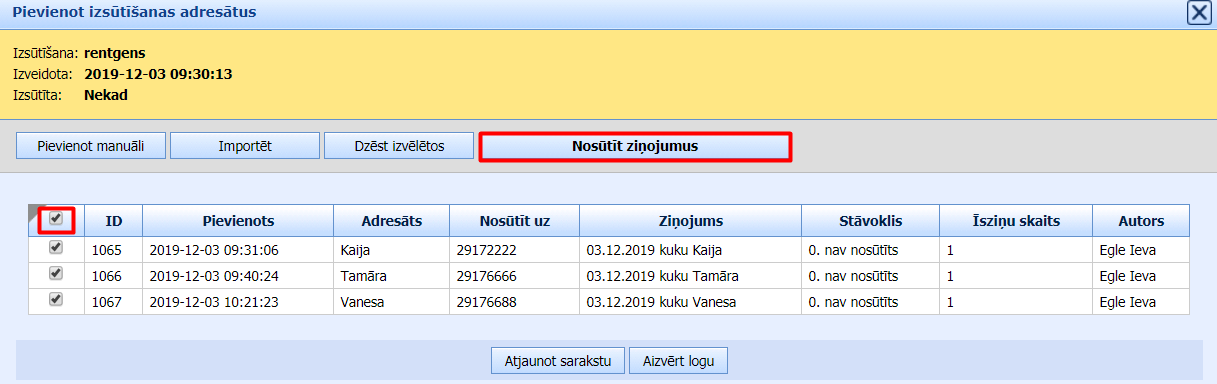Kad pievienoti visi vēlamie adresāti, tos atzīmē, ieklikšķinot izvēles rūtiņu saraksta virsraksta rindā un klikšķina pogu “Nosūtīt ziņojumus“: