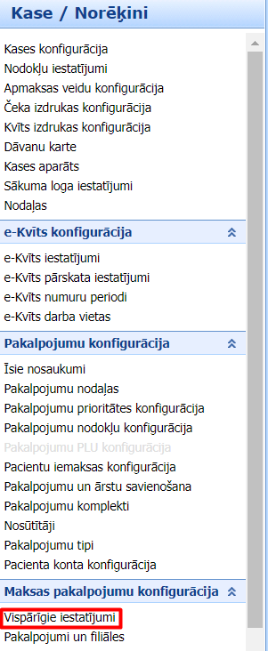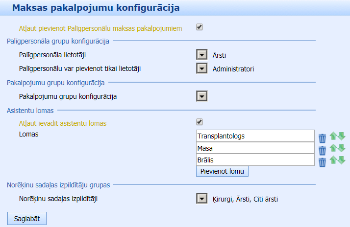 Sadaļā Sistēmas konfigurācija > Kase/Norēķini > Maksas pakalpojumu konfigurācija > Vispārīgie iestatījumi ir iespēja noteikt lietotāju grupas, no kurām Norēķinu modulī var izvēlēties speciālistus un ārstus, sagatavojot rēķinu. Pēc noklusētā iespējams izvēlēties jebkuru iestādes vai prakses aktīvo lietotāju: