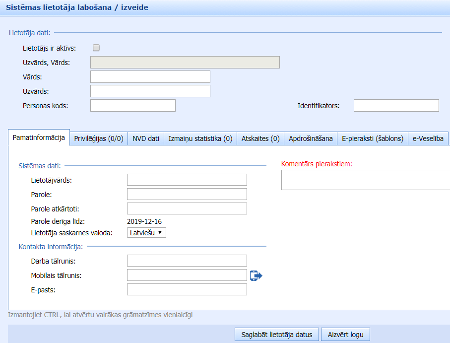 Nepieciešams atzīmēt, ka lietotājs ir aktīvs. Ja lietotājam nepieciešams izsniegt pieejas datus, izvēlas lietotājvārdu un paroli. Pēc noklusētā paroles derīguma termiņš ir paroles izveidošanas diena.