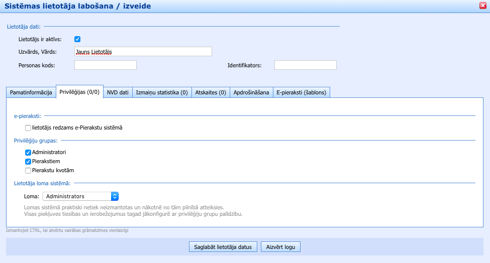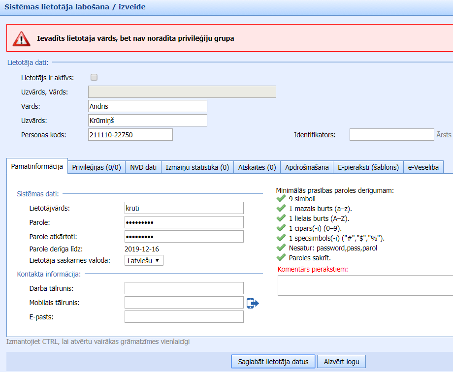 Aizpildot datus lapiņā “Pamatinformācija” un klikšķinot “Saglabāt lietotāja datus“, tiek attēlots paziņojums uz sārta fona, ka lietotājam nav norādītas privilēģiju grupas. Tādējādi lietotāju var pievienot tikai tad, ja tas pievienots kādai lietotāju grupai: