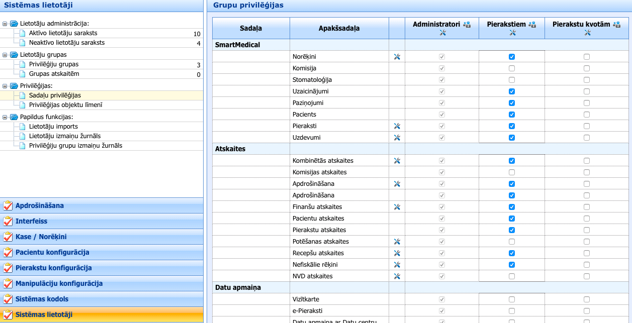 Apakšsadaļā Privilēģijas var izvēlēties lietotāja grupas un lomas. Piederība grupai ļauj noteikt kādas būs lietotāju tiesības SmartMedical sistēmā. Tiesības visām grupā var noteikt “Sadaļu privilēģijas.