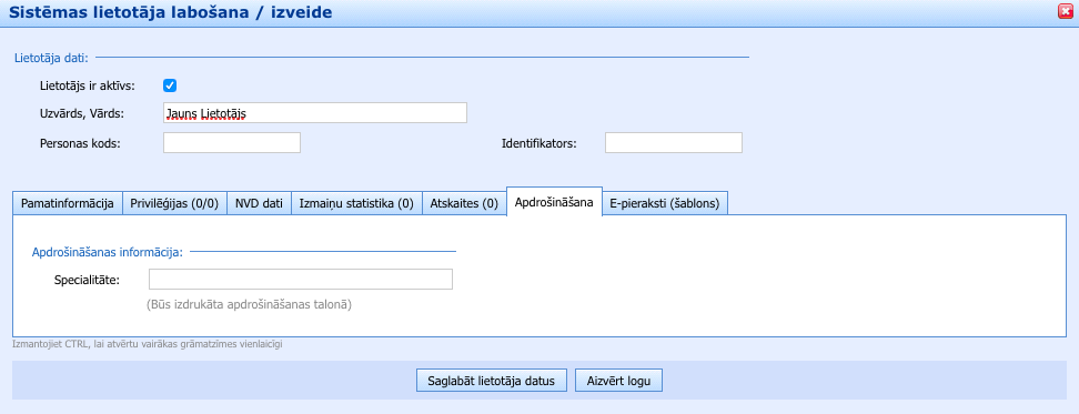 Apakšsadaļā Apdrošināšana var norādīt lietotāja specialitāti, ja tas ir nepieciešams.