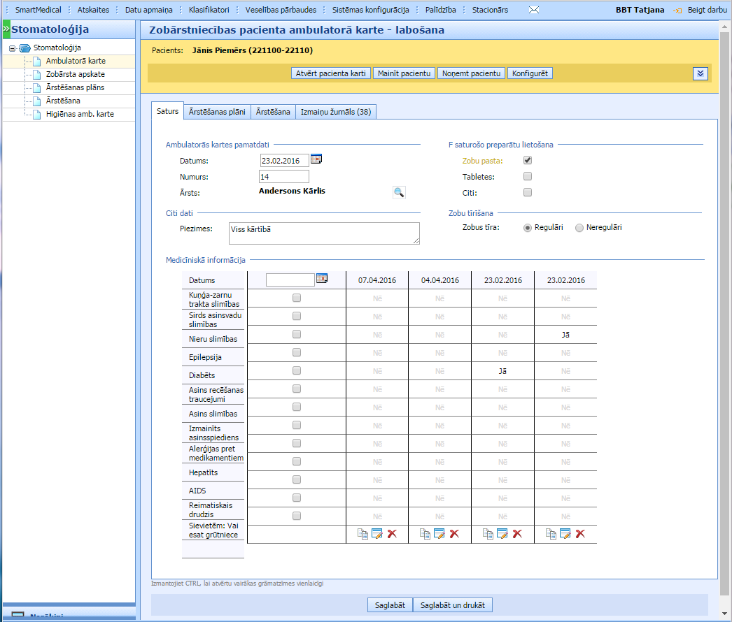 Lai atvērtu pacienta zobārstniecības ambulatoro karti, sadaļā SmartMedical > Pacients jāizvēlas pacients un spiežot SmartMedical > Stomatoloģija jāizvēlas sadaļa “Ambulatorā karte”. Jaunatvērtajā logā ir apakšsadaļas – Saturs, Ārstēšanas plāni un Ārstēšana.Ambulatorās kartes saturā ievadam zobārstneicības pacienta ambulatoras kartes numuru, medicīnisko informāciju par pacientu, kopējo informāciju par pacienta zobu stāvokli un zobu tīrīšanu (cik regulāri, kādi papildus līdzekļi ir izmantoti). Pēc pogas „Saglabāt” vai „Saglabāt un drukāt” nospiešanas „Zobārstniecības pacienta ambulatorā karte” būs izveidota.