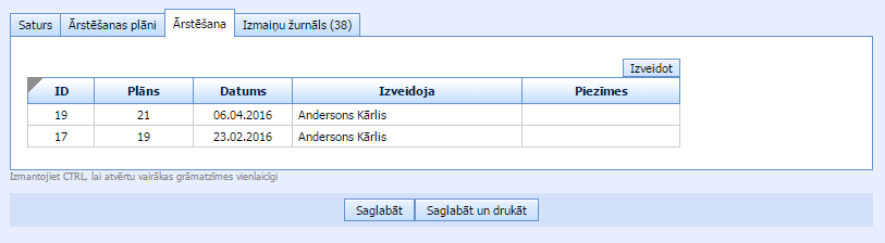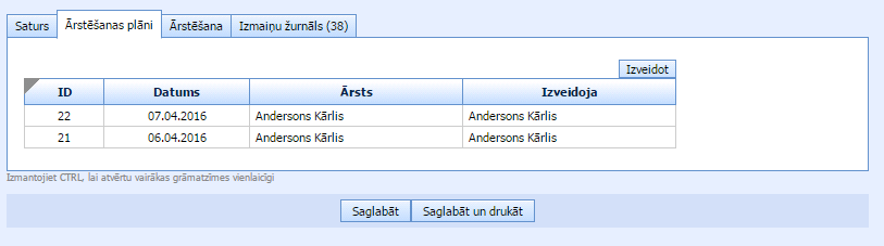 Apakšsadaļā “Ārstēšana” ir saraksts ar paveiktām ārstēšanas manipulācijām. Klikšķinot uz vienu no saraksta, atvērsies izvēlētais ārstēšanas plāns.