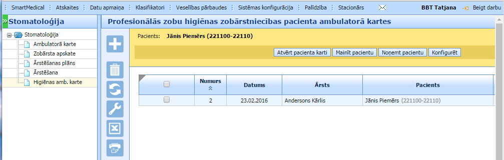 Atverot sadaļu SmartMedical > Stomatoloģija > Higiēnas amb. karte, var redzēt sarakstu ar pacienta zobu higiēnas informāciju. Klikšķinot uz vienu no saraksta, atvērsies pacienta zobu higiēnas ambulatorā karte. Strādājot ar šo sarakstu, var – pievienot jaunu karti sarakstā (spiežot pogu