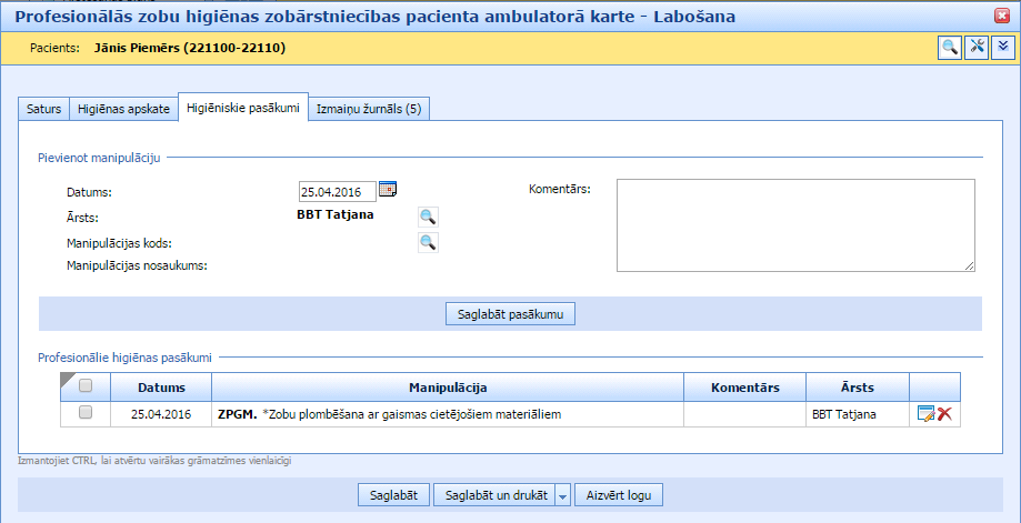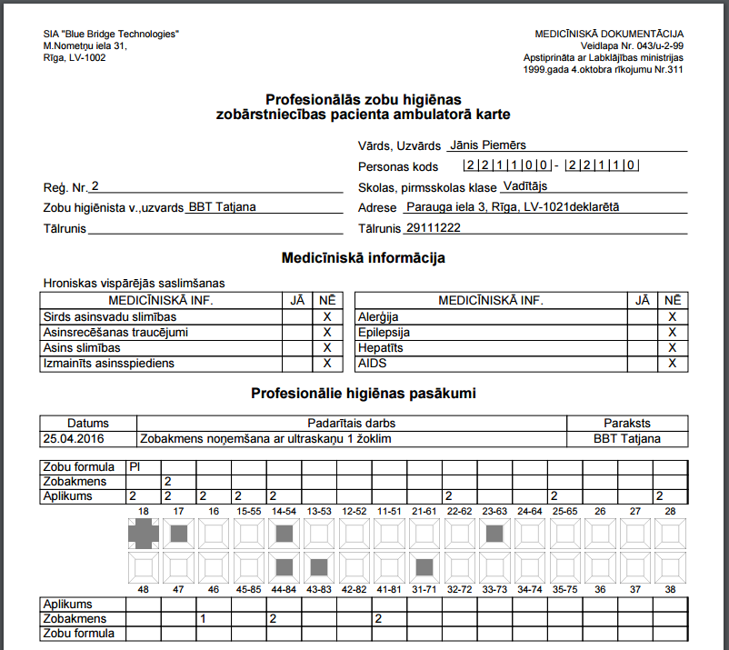 Profesionālās zobu higiēnas zobārstniecības pacienta ambulatoras kartes izdruka