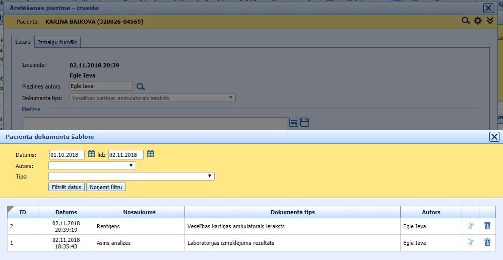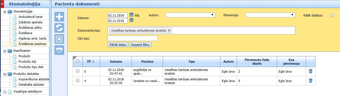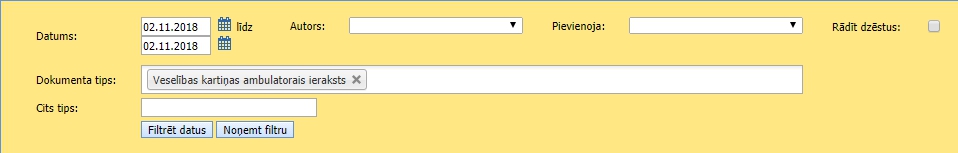 Apakšsadaļas loga augšdaļā ir meklēšanas iestatījumu lauks, lai filtrētu failu sarakstus pēc izveides datuma, autora un viena dokumenta tipa “Veselības kartiņas ambulatorais ieraksti”: