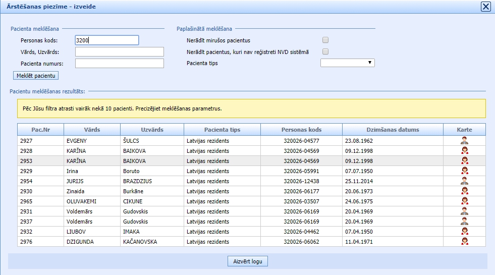 Lai pievienotu jaunu failu kopu, sistēma prasīs izvēlēties pacientu: