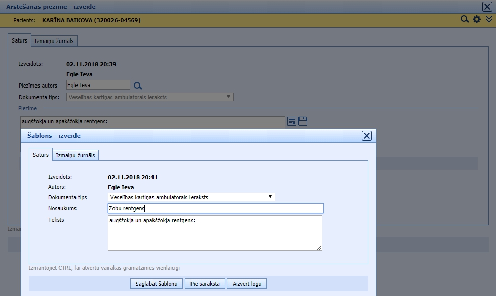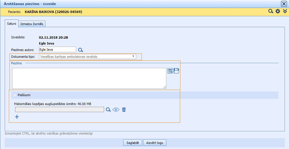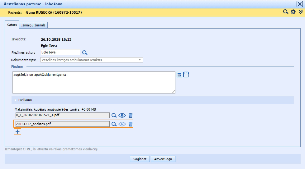 Izvēloties pacientu, atveras jauns logs, kurā var rakstīt ārsta piezīmes un pievienot 5 failus: