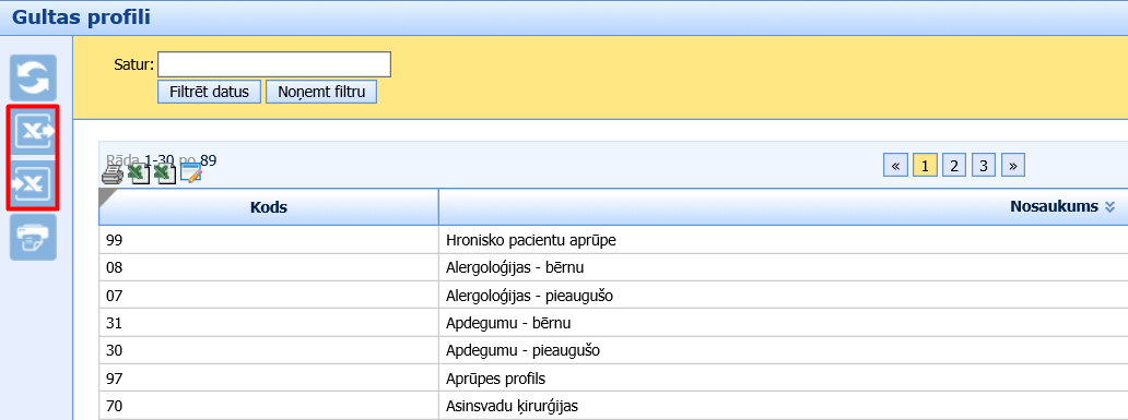Lai atjaunotu/papildinātu klasifikatoru vērtības, sarakstu eksportē uz MS Excel un modificē. Modificēto klasifikatoru importē sistēmā. Importam, eksportam izmanto ikonas, kas simbolizē Excel programmatūru.