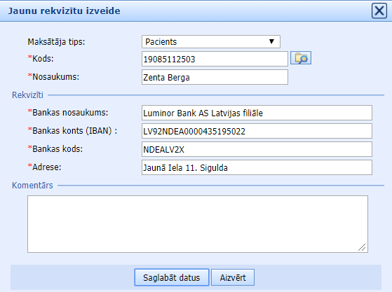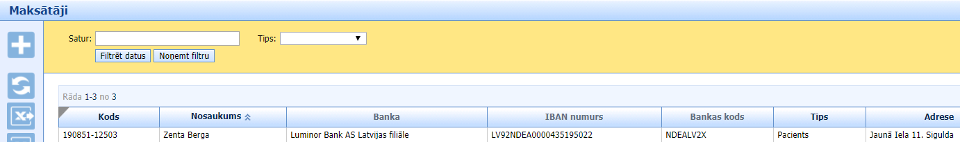 Aizpilda formā norādītos laukus, ievadot maksātāja datus, un saglabā. Maksātāja dati tiek attēloti sarakstā: