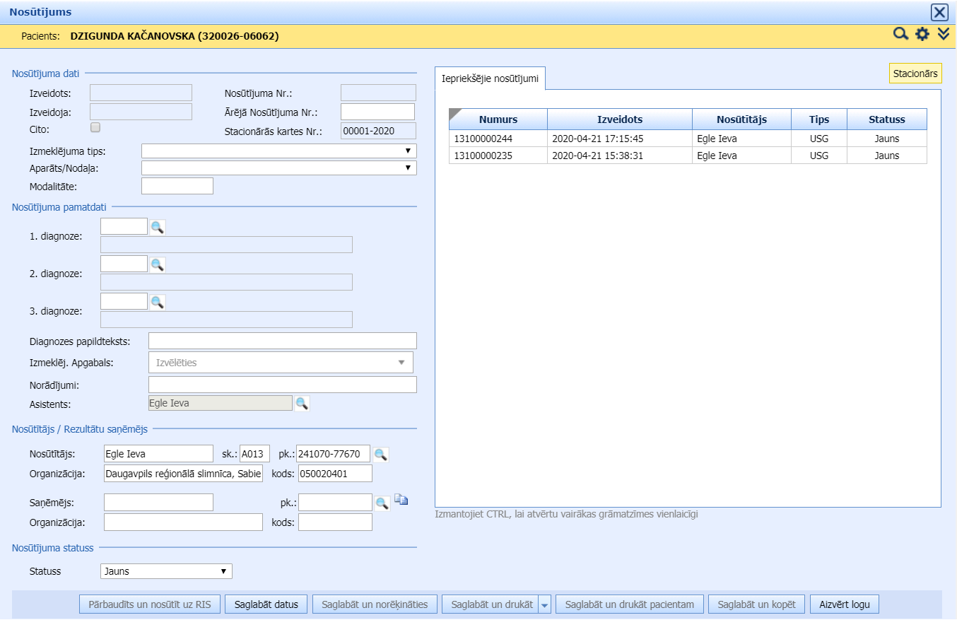 Atveras forma “Nosūtījums“. Ja pacientam jau ir agrāk izveidoti nosūtījumi, atverot šo formu, formas labajā pusē lapiņā “Iepriekšējie nosūtījumi” tiek attēlots pacienta nosūtījumu saraksts :