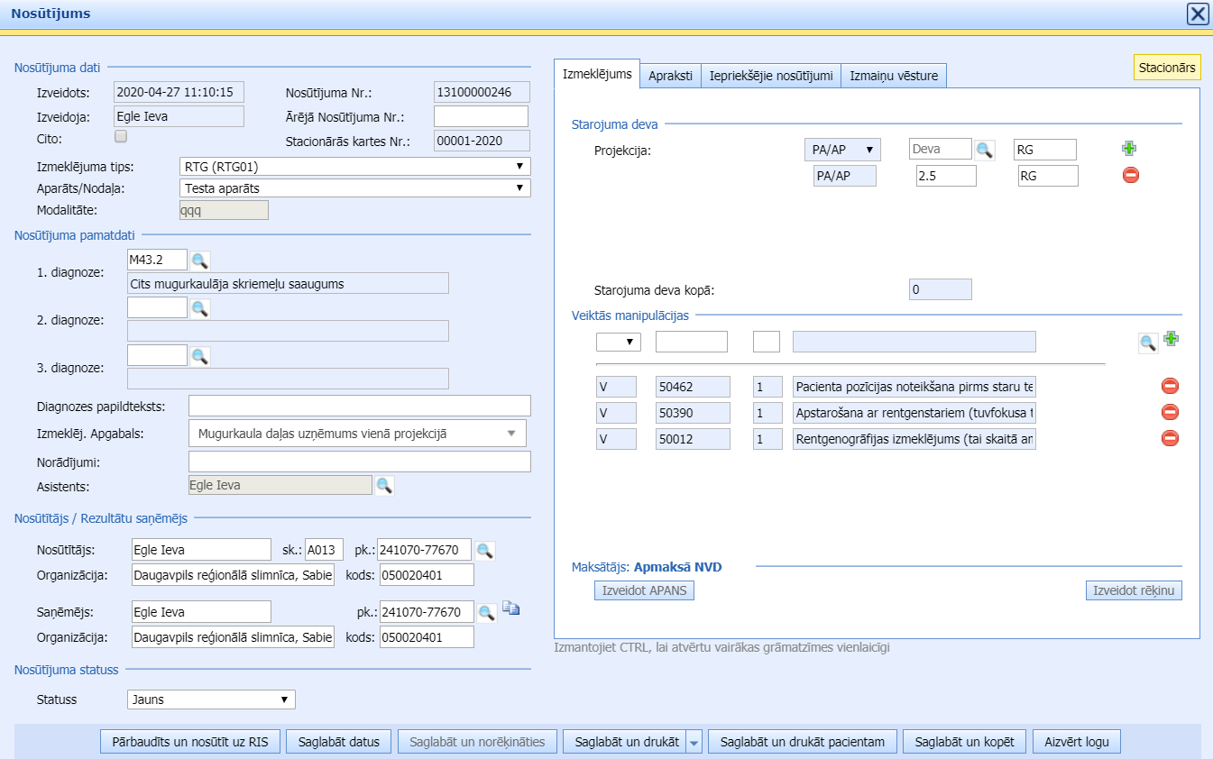 Lai sagatavotu nosūtījumu uz datortomogrāfijas, ultrasonogrāfijas vai rentgenogrāfijas izmeklējumiem, stacionāra kartes lapiņā “Dokumenti” klikšķina pogu “Izveidot nosūtījumu uz RTG“.