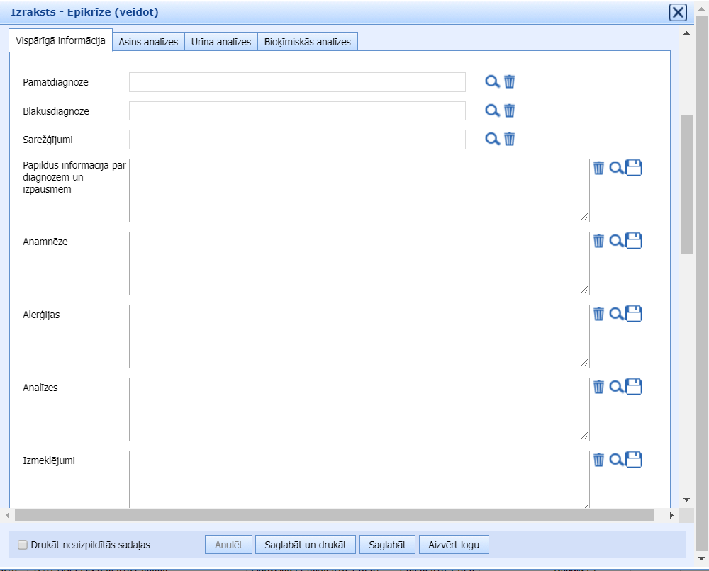 Kad lietotājs ievadījis nepieciešamo informāciju izraksta-epikrīzes formā, informāciju saglabā un/vai izdrukā. Pēc noklusētā neaizpildītās izraksta- epikrīzes sadaļas netiks drukātas.