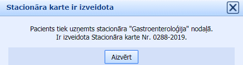 Stacionāra karte tiek izveidota automātiski, kad SmartMedical sistēmā tiek apstiprināts lēmums par pacienta uzņemšanu stacionārā.Lietotājam tiek attēlots informatīvs paziņojums par kartes izveidošanu.