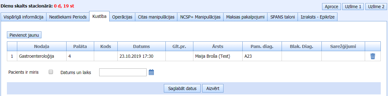 Katru nākamo diagnozi pievieno, klikšķinot uz + ikonas. Kļūdas gadījumā ierakstu dzēš, klikšķinot uz atkritnes ikonas.Informāciju saglabā, klikšķinot pogu “Saglabāt datus”.Katru nākamo kustību pievieno, klikšķinot pogu “Pievienot jaunu” lapiņā “Kustība”.