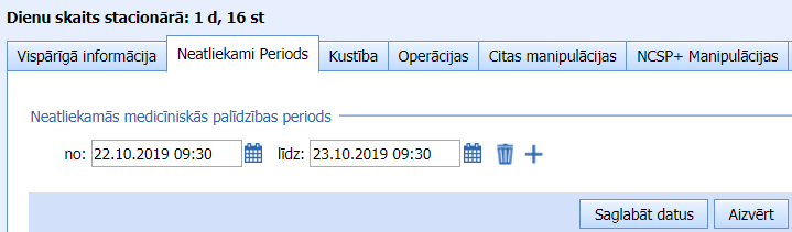 Ja pacientam ir neatliekamās medicīniskās palīdzības sniegšanas periodi, tos ievada lapiņā “Neatliekami periods“, fiksējot sākuma un beigu laiku.Katru nākamo periodu pievieno, klikšķinot uz + ikonas.