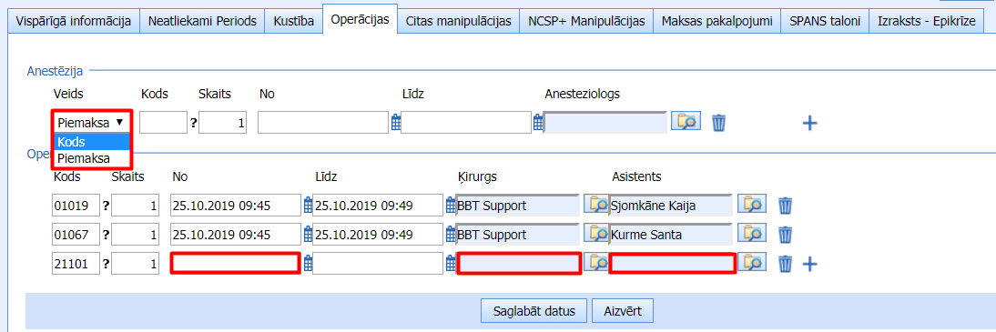 Operāciju un anestēziju manipulācijām jāievada gan sākuma, gan beigu laiks.
