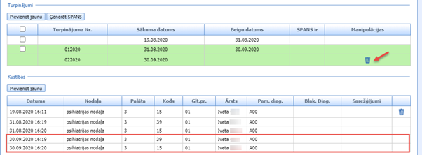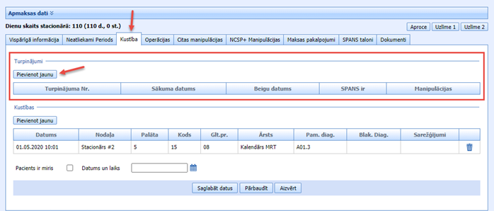 Turpinājumusnevar veidot, ja pacients ir izrakstīts no stacionāra. Tādā gadījumā poga“Pievienot jaunu” ir atspējota.