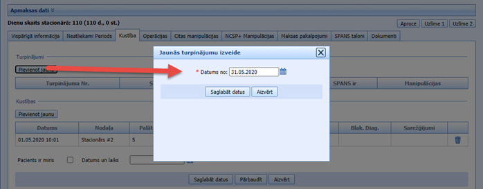 Ja pacients nav izrakstīts no stacionāra, pēdējāturpinājuma beigu datums ir rediģējams.