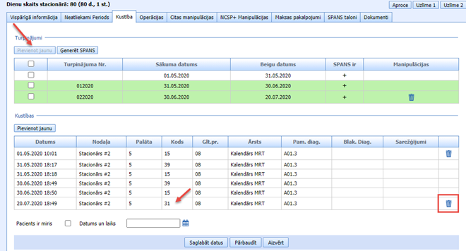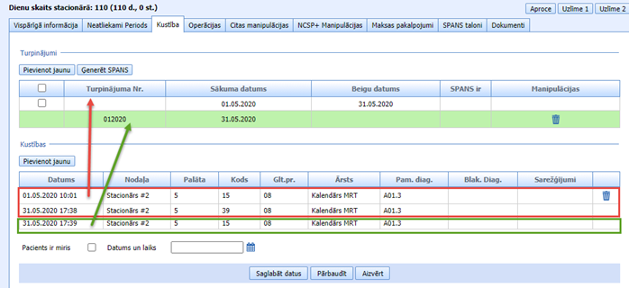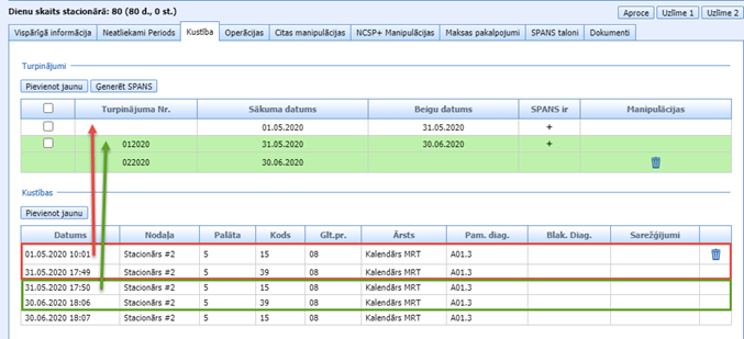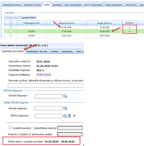 Veidojotturpinājumus un ģenerējot talonus pa periodiem, stacionāra kartes tabāVispārīgā informācija ir redzams periods, kuram jau ir izveidoti SPANS taloni.