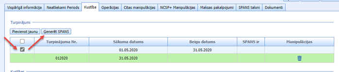 Lai sagatavotuSPANS talonu sākotnējam periodam, ir nepieciešams atzīmēt Turpinājumu bezNumura un nospiest pogu Ģenerēt SPANS: